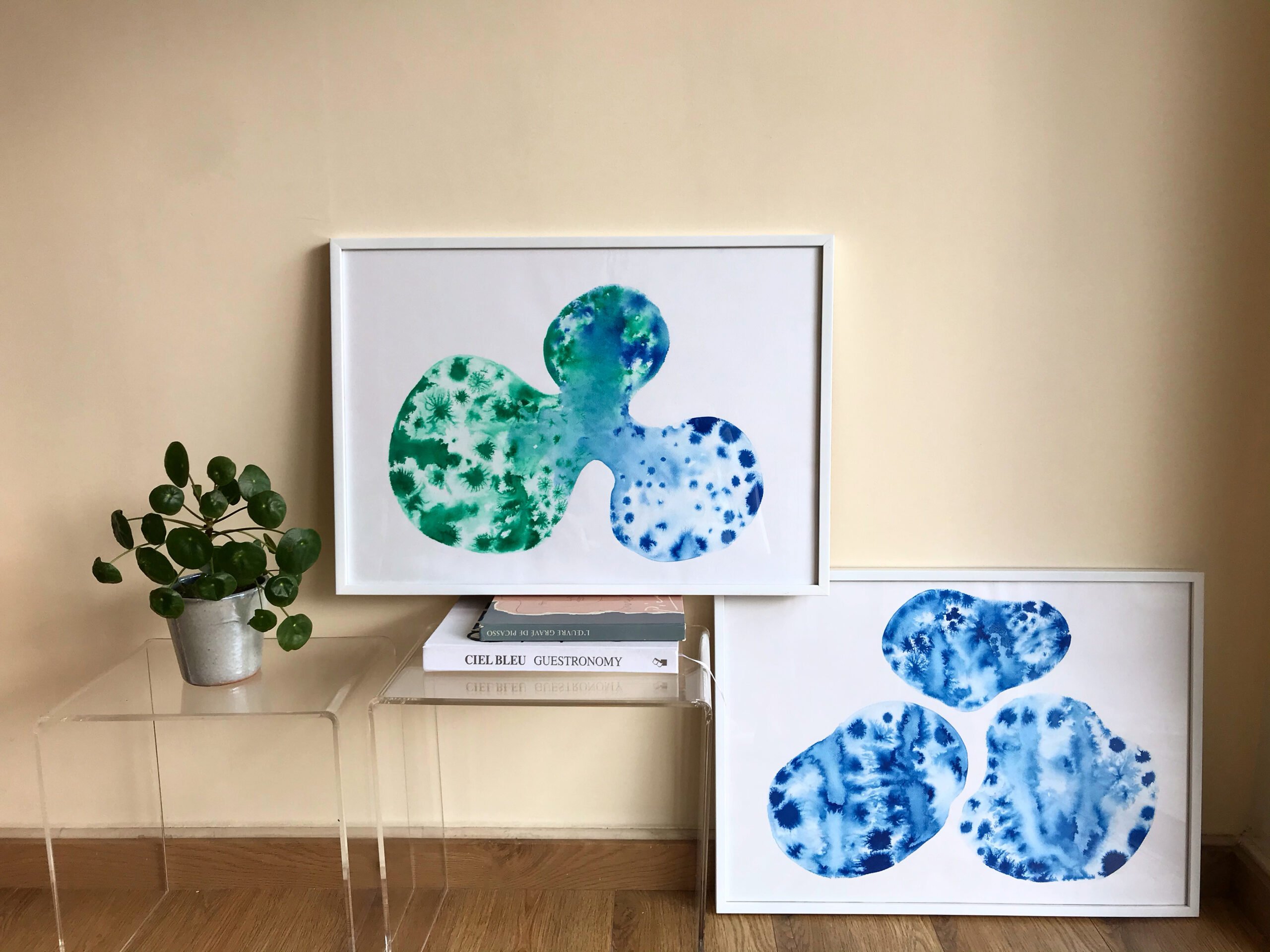 My technique put water at the forefront. I give trust to the uncontrollable movement of water, as one should trust the uncontrollable nature of life. I find a sense of freedom when applying this technique, it is a way for me to focus on the process and not on the final result. In my artworks, I use blue ink or homemade ink using natural pigments from Morocco. I use the color blue as a reminder to my blues but as well as a color known for its calming nature. Sometimes, I like to play with black ink, green ink, and embroidery. I also like to document my journey by sharing confessional poetry.